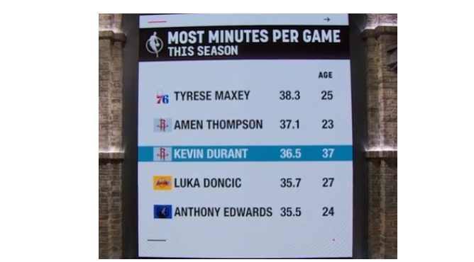 • 本季场均出场时间榜 37岁杜兰特第3东契奇第4 前五仅他过30岁